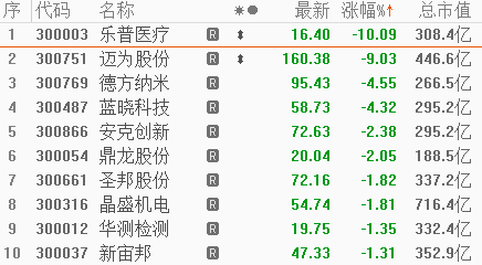 乐普医疗跌10%,迈为股份跌超9%,德方纳米、蓝晓科技跌超4%,安克创新、鼎龙股份等跌超2%。