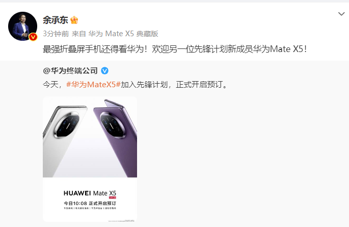 金融界9月8日消息 华为余承东发文表示,最强折叠屏手机还得看华为,欢迎先锋计划新成员华为Mate X5。