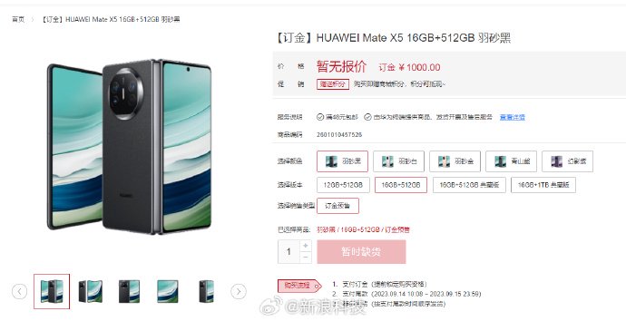 消息面上,今日华为MateX5正式开启预订,突然的公布,Mate X5系列还是供不应求,上线后秒光,官网显示“暂时缺货”。