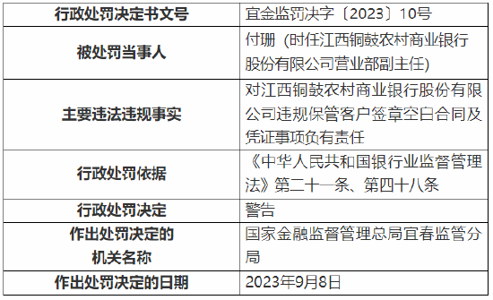 9月18日,国家金融监督管理总局宜春监管分局发布的行政处罚信息公开表显示,江西铜鼓农村商业银行因违规保管客户签章空白合同及凭证、虚增存贷款,被国家金融监督管理总局宜春监管分局罚款60万元;同时,两名相关责任人付珊、曹钢明被警告。
