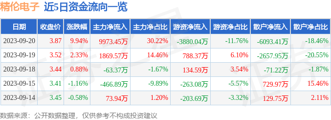 精伦电子涨停收盘,收盘价3.87元。该股于9点35分涨停,2次打开涨停,截止收盘封单资金为4380.41万元,占其流通市值2.3%。