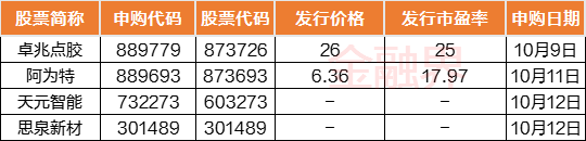 长假后首个交易周(10月9日-10月13日)A股市场4只新股发行,其中沪市主板1只,创业板1只,北交所2只。具体安排如下,周一1只,卓兆点胶(北交所);周三1只:阿为特(北交所);周四2只,天元智能(沪市主板)、思泉新材(创业板),上述公司股票的申购将在本周陆续开放。