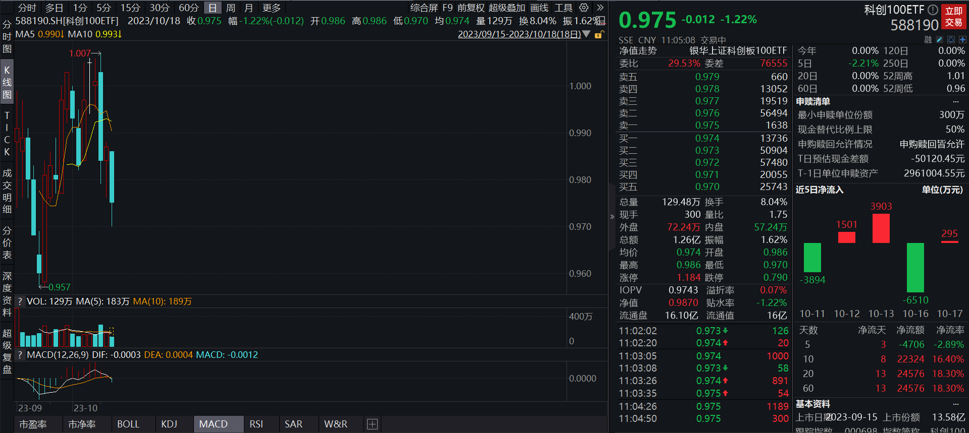 截至2023年10月18日11:05,科创100ETF(588190)盘中回调1.22%,报0.975元,换手率8.04%,委比达29.53%,成交额不断扩大,市场交投活跃。