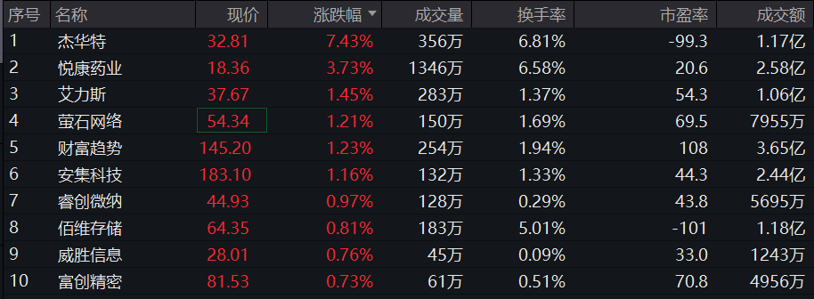 科创100ETF(588190)紧密跟踪上证科创板100指数,截至2023年10月18日11:05,指数成份股中,杰华特领涨7.43%,悦康药业上涨3.73%,艾力斯上涨1.45%,萤石网络、财富趋势等个股跟涨超1%。