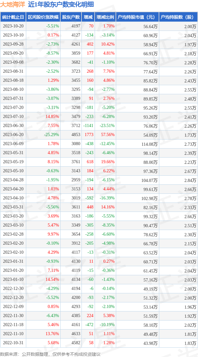 从股价来看,2023年10月10日至2023年10月20日,大地海洋区间跌幅为5.51%,在此期间股东户数增加70.0户,增幅为1.7%。