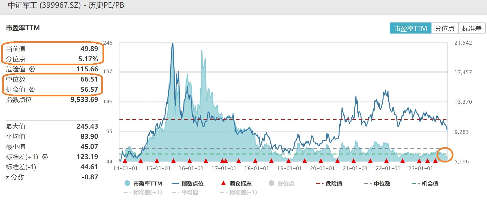 值得注意的是,时隔半年左右,国防军工ETF(512810)标的指数中证军工最新PE估值再度跌破50倍,处于指数发布以来5.17%历史分位,也远低于56.57倍的机会值。随着二级市场连续回调,国防军工板块估值已经处于历史底部区间,板块整体性机会渐行渐近。