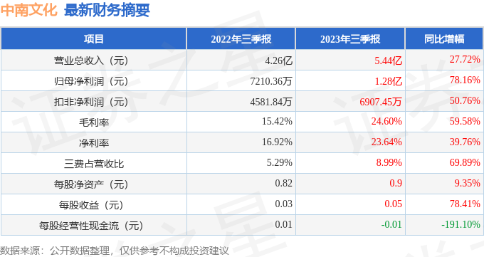 据证券之星公开数据整理,近期中南文化(002445)发布2023年三季报。根据财报显示,本报告期中中南文化营收净利润同比双双增长,三费占比上升明显。截至本报告期末,公司营业总收入5.44亿元,同比上升27.72%,归母净利润1.28亿元,同比上升78.16%。按单季度数据看,第三季度营业总收入2.23亿元,同比上升79.03%,第三季度归母净利润96.09万元,同比上升100.76%。