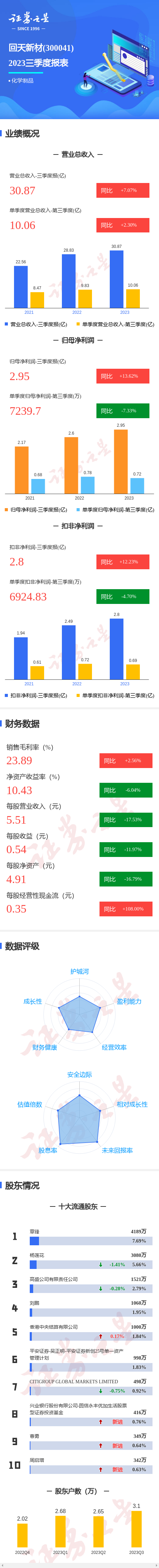 证券之星消息,回天新材2023年三季报显示,公司主营收入30.87亿元,同比上升7.07%;归母净利润2.96亿元,同比上升13.62%;扣非净利润2.8亿元,同比上升12.23%;其中2023年第三季度,公司单季度主营收入10.06亿元,同比上升2.3%;单季度归母净利润7239.71万元,同比下降7.33%;单季度扣非净利润6924.83万元,同比下降4.7%;负债率53.07%,投资收益915.15万元,财务费用982.33万元,毛利率23.89%。