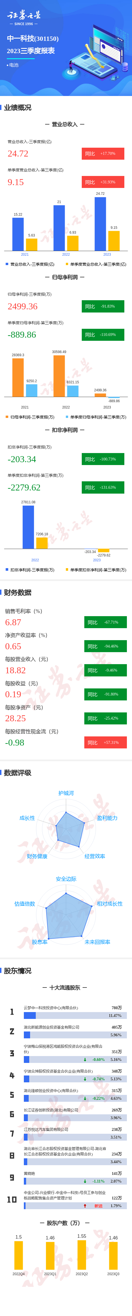 证券之星消息,中一科技2023年三季报显示,公司主营收入24.73亿元,同比上升17.7%;归母净利润2499.36万元,同比下降91.83%;扣非净利润-203.35万元,同比下降100.73%;其中2023年第三季度,公司单季度主营收入9.15亿元,同比上升31.93%;单季度归母净利润-889.86万元,同比下降110.69%;单季度扣非净利润-2279.62万元,同比下降131.63%;负债率27.49%,投资收益1049.55万元,财务费用-242.96万元,毛利率6.87%。