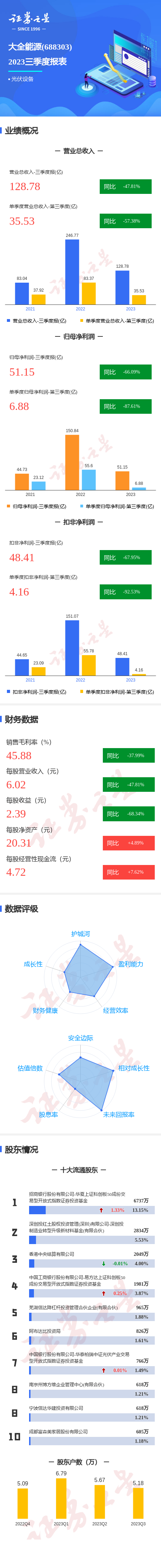 证券之星消息,大全能源2023年三季报显示,公司主营收入128.78亿元,同比下降47.81%;归母净利润51.15亿元,同比下降66.09%;扣非净利润48.42亿元,同比下降67.95%;其中2023年第三季度,公司单季度主营收入35.53亿元,同比下降57.38%;单季度归母净利润6.89亿元,同比下降87.61%;单季度扣非净利润4.17亿元,同比下降92.53%;负债率13.45%,财务费用-2.53亿元,毛利率45.88%。