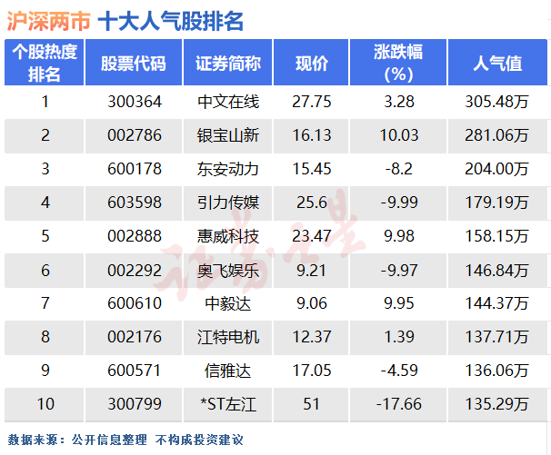 12月20日沪深两市继续调整,成交量变化不大。板块上能源、公用事业板块领涨,电信、券商板块走势较为疲软。人气股方面银宝山新、惠威科技、中毅达涨停,*ST左江跌超17%,引力传媒、奥飞娱乐跌停。下面是今日十大人气股排名的详细情况。
