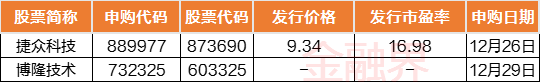 本周(12月25日—12月29日)A股市场有2只新股发行,其中沪市主板1只,北交所1只。分别是周二发行的捷众科技、周五发行的博隆技术。捷众科技是一家专注于研发、生产和销售精密汽车零部件的高新技术企业,拟在北交所发行上市,发行价格为9.34元/股。博隆技术拟在上交所主板公开发行1667万股,预计募资11.01亿元,投建聚烯烃气力输送成套装备项目、智能化粉粒体物料处理系统扩能改造项目、研发及总部大楼建设项目,并补充流动资金。