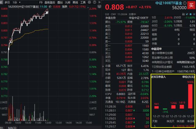 巨量资金提前埋伏!12月27日中证100ETF基金(562000)单日获超9000万资金净申购,近3日连续吸金合计1.17亿元!最新基金份额达10.18亿份,创上市以来新高!最新基金规模8.06亿元,在跟踪中证100指数的10只ETF中规模最大。