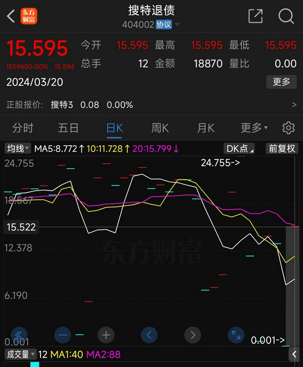 3月18日,搜特退债公告称,公司不能按时支付债券利息。这意味着,搜特退债可能将是历史上第一只实质性违约的可转债。在此背景下,3月20日,搜特退债协议转让价格暴涨1万5千倍。