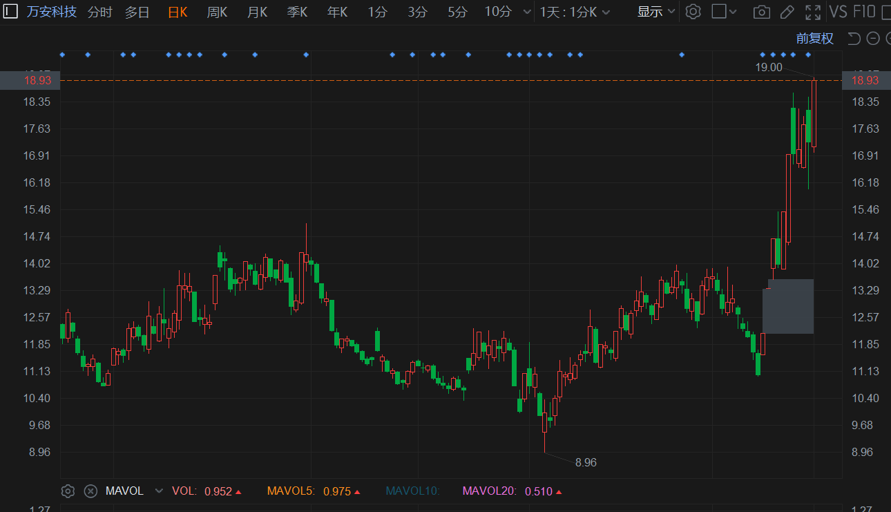 万安科技(002590.SZ)触及涨停,报19元续刷阶段新高,近11日累计升幅超70%,总市值90.6亿元。日前公布的一季度营业收入8.15亿元,同比增长7.03%;归属于上市公司股东的净利润2116.66万元,同比增长1890.93%。另外,小鹏汇天日前到万安科技调研,就推进相关项目开展深入交流。此前,万安科技控股子公司安徽万安就已收到国内某知名飞行汽车公司出具的《定点开发通知书》,被客户选定为某车型前副车架总成产品的供应商。