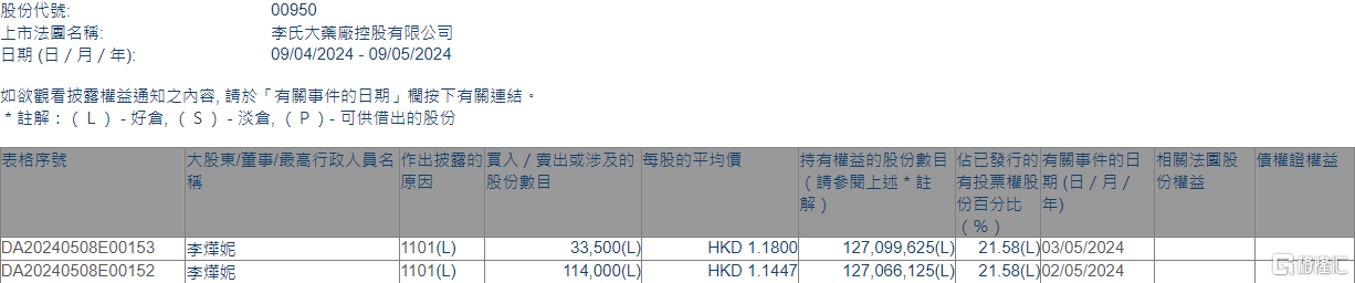 格隆汇5月9日丨根据联交所最新权益披露资料显示,2024年5月2日-5月3日,李氏大药厂(00950.HK)获执行董事李烨妮在场内以每股均价1.1447-1.18港元增持14.75万股,涉资约17万港元。