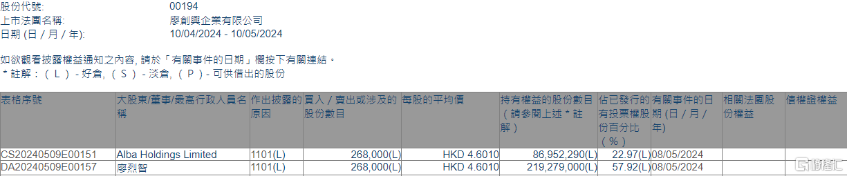 格隆汇5月10日丨根据联交所最新权益披露资料显示,2024年5月8日,廖创兴企业(00194.HK)获执行董事、董事会主席、行政总裁兼董事总经理廖烈智在场内以每股均价4.601港元增持26.8万股,涉资约123.31万港元。