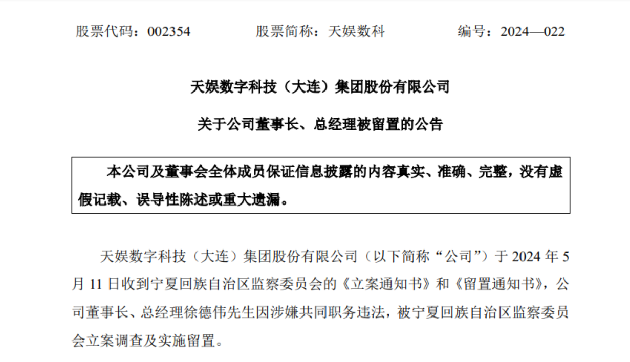 5月12日,天娱数科称,公司2024年5月11日收到宁夏回族自治区监察委员会的《立案通知书》和《留置通知书》。公司董事长、总经理徐德伟先生因涉嫌共同职务违法,被宁夏回族自治区监察委员会立案调查及实施留置。