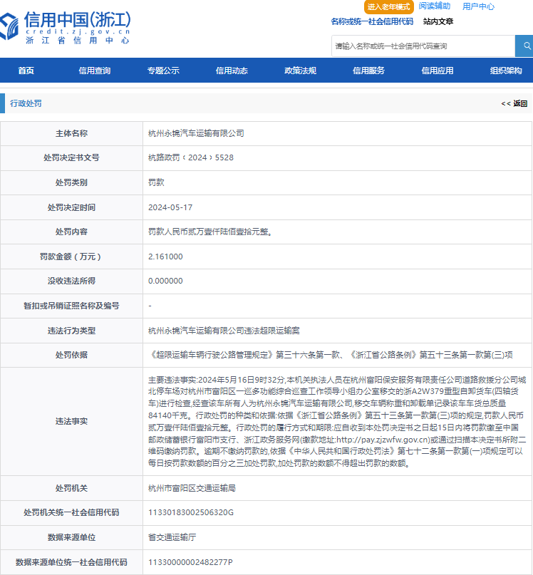 金融界2024年5月17日消息,杭州永锦汽车运输有限公司因违法超限运输,被杭州市富阳区交通运输局罚款人民币2万1610元整。