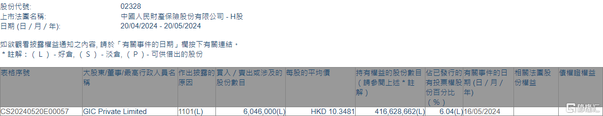 格隆汇5月20日丨根据联交所最新权益披露资料显示,2024年5月16日,中国财险(02328.HK)获GIC Private Limited在场内以每股均价10.3481港元增持604.6万股,涉资约6256.5万港元。