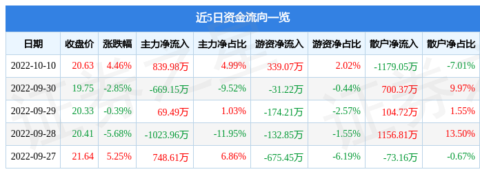 资金流向数据方面,10月10日主力资金净流入839.98万元,游资资金净流入339.07万元,散户资金净流出1179.05万元。