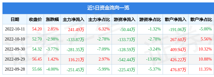 资金流向数据方面,10月11日主力资金净流入241.49万元,游资资金净流出50.44万元,散户资金净流出191.06万元。
