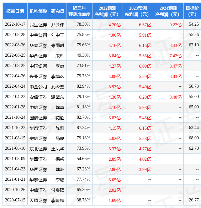 证券之星数据中心根据近三年发布的研报数据计算,华泰证券陈莉研究员团队对该股研究较为深入,近三年预测准确度均值高达87.34%,其预测2022年度归属净利润为盈利4.15亿,根据现价换算的预测PE为33.82。