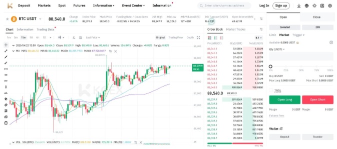 在费用方面,KCEX的优势非常明显:期货交易挂单者(Maker)费用为 0%,吃单者(Taker)费用仅0.01%,远低于大多数竞争对手。平台的撮合引擎可每秒处理超过 100,000笔交易,确保高频交易环境下依旧能够快速、高效完成订单。