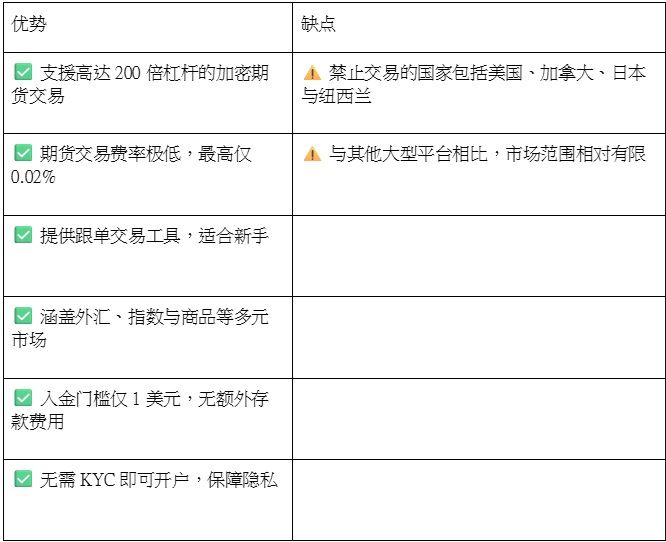 ➡️ 多元市场: 除了加密货币,还涵盖外汇、股指与商品。