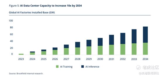 未来,AI推理市场预计将占据增长的主导地位。今年推出的MI355芯片以及明年计划推出的MI400芯片,有望使英伟达在市场份额争夺中面临更大压力。布鲁克菲尔德(Brookfield)预测,推理芯片的销量将很快与AI训练芯片的需求持平;到2028年,推理芯片的功耗需求将接近训练芯片水平;到2034年,AI芯片的总需求将增长10倍。