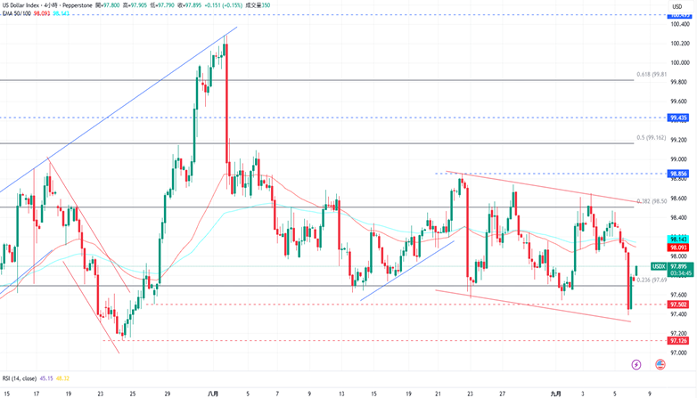 美元指数自97.389反弹,以消化RSI指标的超卖现象,并准备测试EMA50价格区间。CPT Markets分析师指出,上涨方面,美元指数接下来的阻力为EMA50所在的98.101,再来是9月3日的高点98.649。下跌方面,美元指数目前的支撑为9月5日的低点97.389,接着是7月24日的低点97.176。