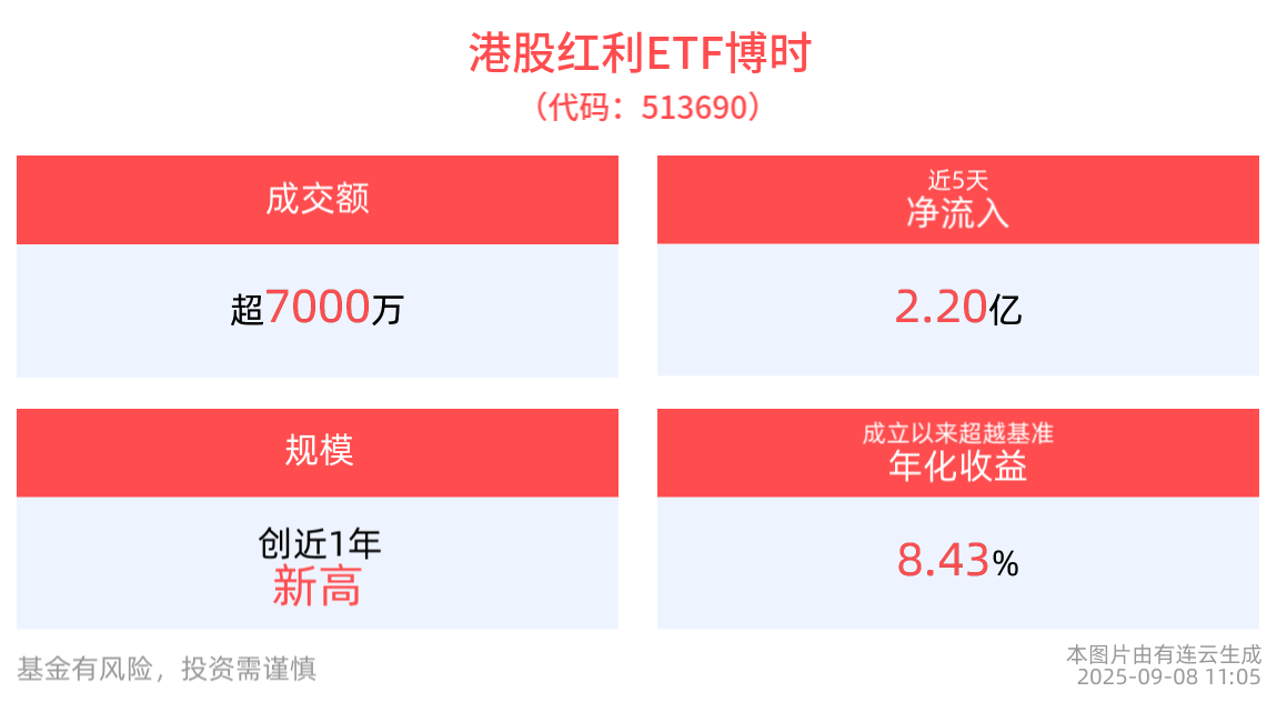 流动性方面,港股红利ETF博时盘中换手1.46%,成交7243.87万元。拉长时间看,截至9月5日,港股红利ETF博时近1月日均成交2.18亿元。
