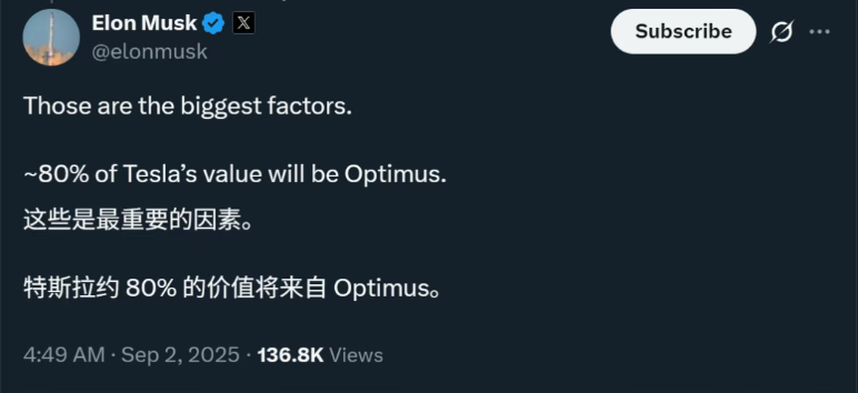 对于如何实现宏图计划4.0,特斯拉创始人兼首席执行官马斯克重申了机器人业务在特斯拉的战略地位。他表示,FSD和Optimus的规模化将是最为重要的事项,因为未来特斯拉约80%的价值将来自Optimus机器人。