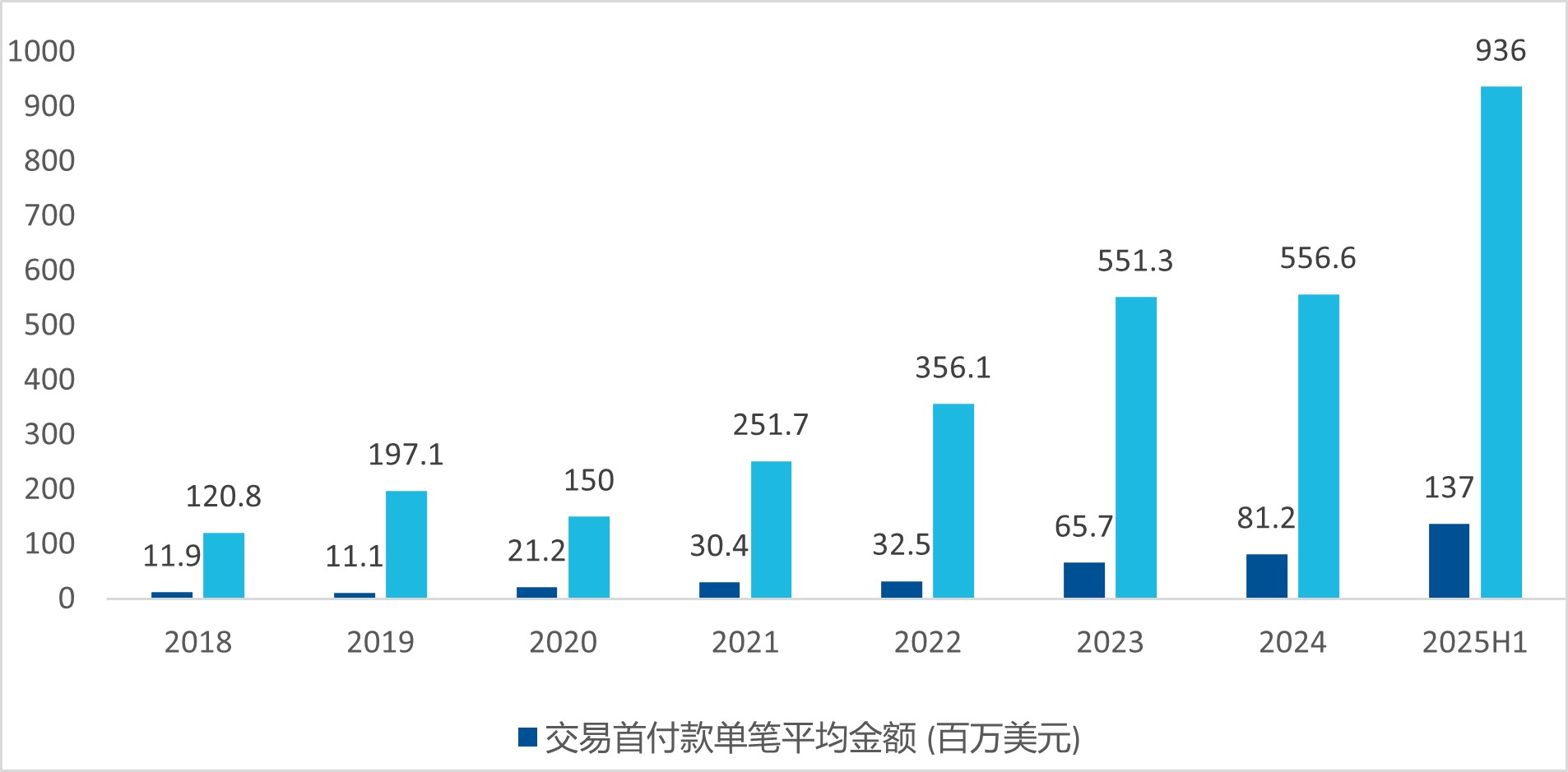 2025H1 交易首付款单笔平均金额(百万美元),约为全球均值98%
