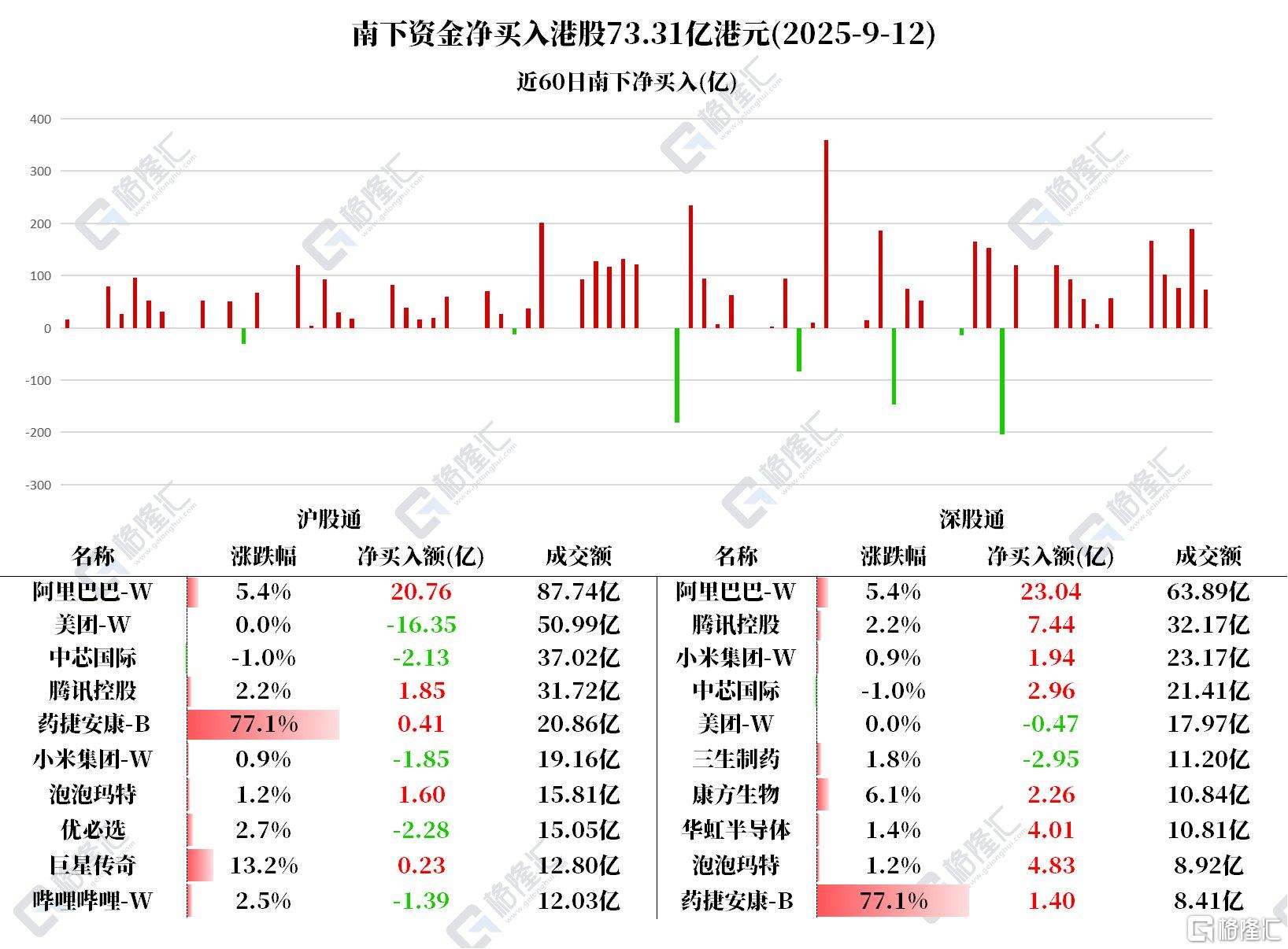 9月12日,南下资金净买入港股73.31亿港元。