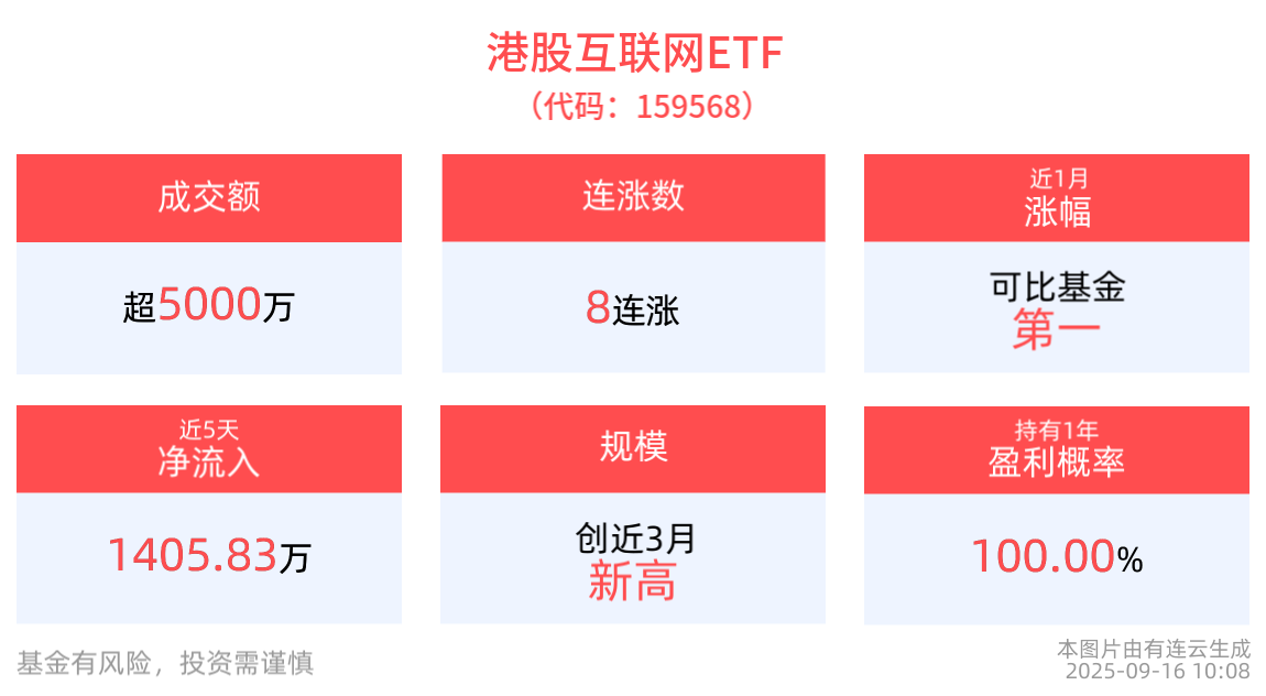 流动性方面,港股互联网ETF盘中换手15.24%,成交5515.02万元,市场交投活跃。拉长时间看,截至9月15日,港股互联网ETF近1周日均成交2.50亿元。