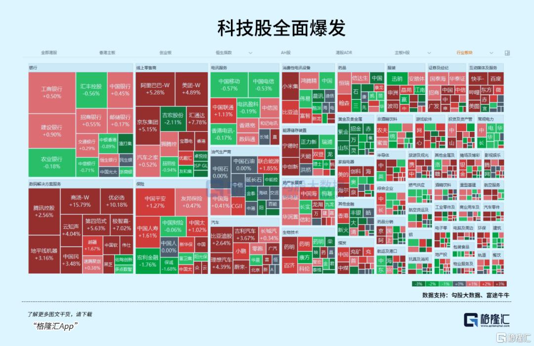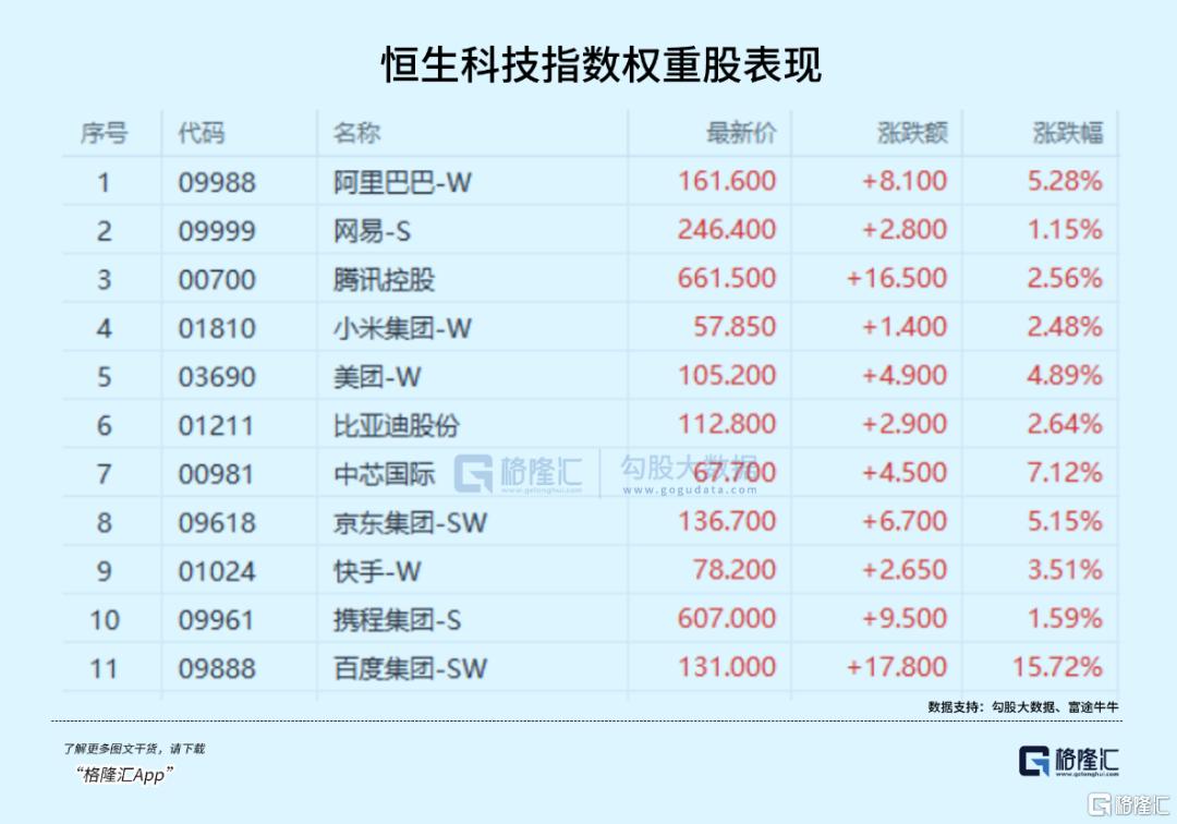 权重大的科网股表现非常亮眼,百度集团、京东集团、阿里巴巴,美团、腾讯分别上涨15.72%、5.15%、5.28%、4.89%、2.56%。