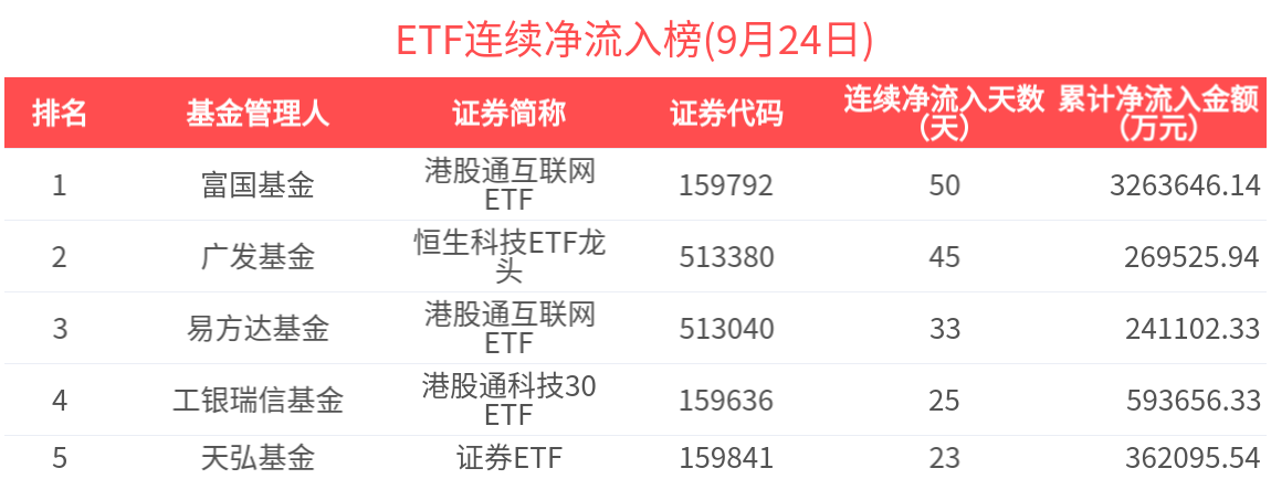 近期连续净流入的ETF基金有163只,居前的为港股通互联网ETF(50天)、恒生科技ETF龙头(45天)、港股通互联网ETF(33天)、港股通科技30ETF(25天)、证券ETF(23天),分别净流入326.36亿元、26.95亿元、24.11亿元、59.37亿元、36.21亿元。其中,港股通科技30ETF近25天加速流入,近25天累计流入59.37亿元,基金规模快速增长至398.13亿元。