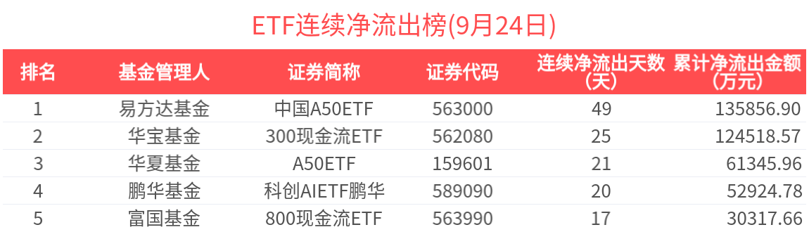 连续净流出的ETF基金有242只,居前的为中国A50ETF(49天)、300现金流ETF(25天)、A50ETF(21天)、科创AIETF鹏华(20天)、800现金流ETF(17天),分别净流出13.59亿元、12.45亿元、6.13亿元、5.29亿元、3.03亿元。其中,中国A50ETF近49天加速流出,近49天累计流出13.59亿元,基金规模快速下降至32.75亿元。