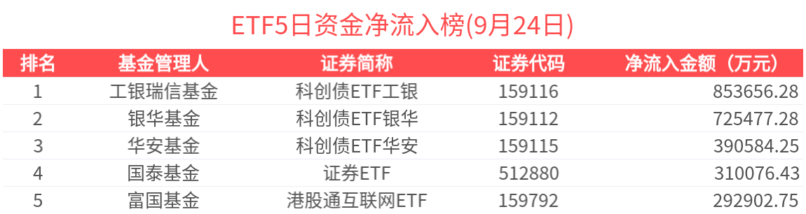 2025年9月24日共280只ETF基金获资金净流入,498只ETF基金净流出。净流入金额超1亿元的有55只,科创债ETF工银(159116)、科创债ETF银华(159112)、科创债ETF华安(159115)、科创债ETF南方(159700.SZ)、科创债ETF天弘(159111)资金显著流入,分别净流入85.37亿元、72.55亿元、39.06亿元、15.82亿元、9.82亿元(净申购份额*单位净值)。