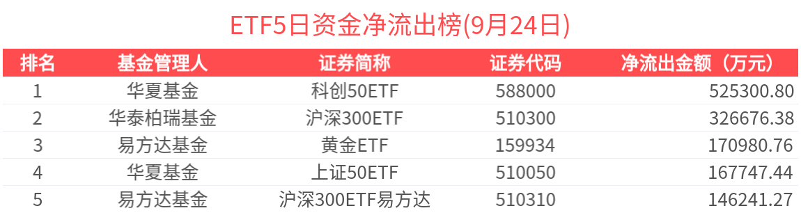 近5天累计净流出超过1亿元的有77只,金额居前的为科创50ETF、沪深300ETF、黄金ETF、上证50ETF、沪深300ETF易方达等,分别净流出52.53亿元、32.67亿元、17.10亿元、16.77亿元、14.62亿元。其中,科创50ETF近5天资金大幅净流出,基金规模快速下降至725.89亿元。