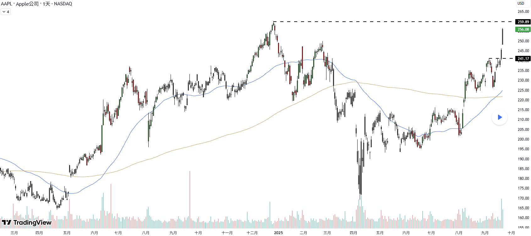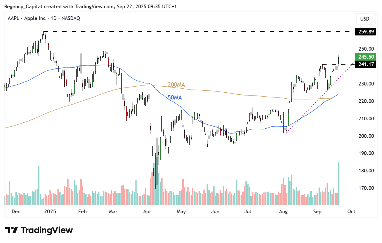 日線圖顯示氛圍明顯轉向。股價持續走出「高點更高、低點也更高」的節奏,這通常是可持續上漲趨勢的基石。今年上半年長時間的盤整,如今正逐步讓位於更具建設性的價格結構。 均線走勢進一步強化這一變化。50 日均線已上穿 200 日均線,形成「黃金交叉」,許多交易者視之為趨勢轉折的確認訊號。50 日均線目前也正作為動態支撐,而自 8 月低點延伸的上升趨勢線正引導行情復甦。結構與均線的契合,顯示買方信心正在提升。先前反彈缺乏成交量支撐,但這次突破震盪區高點時,成交量顯著放大,顯示資金正廣泛參與,願意在更高價位進場。若此態勢持續,股價上行阻力最小的路徑將指向 2024 年 12 月的高點。 接下來的關鍵在於,蘋果能否在回檔時守住突破位。回測已被突破的壓力區並不罕見,屆時股價的表現將成為檢驗趨勢強度的重要依據。目前來看,技術面背景為今年以來最強,多頭終於掌握主導權。