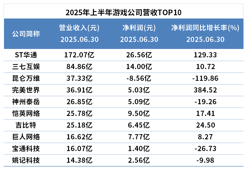 从2025年上半年财务数据来看,行业头部效应愈发显著。营收方面,世纪华通以172.07亿元遥遥领先,是第二名三七互娱的两倍多,头部效应显著;而排名靠后的巨人网络、宝通科技、姚记科技营收均在2亿元以下,与头部企业差距较大。