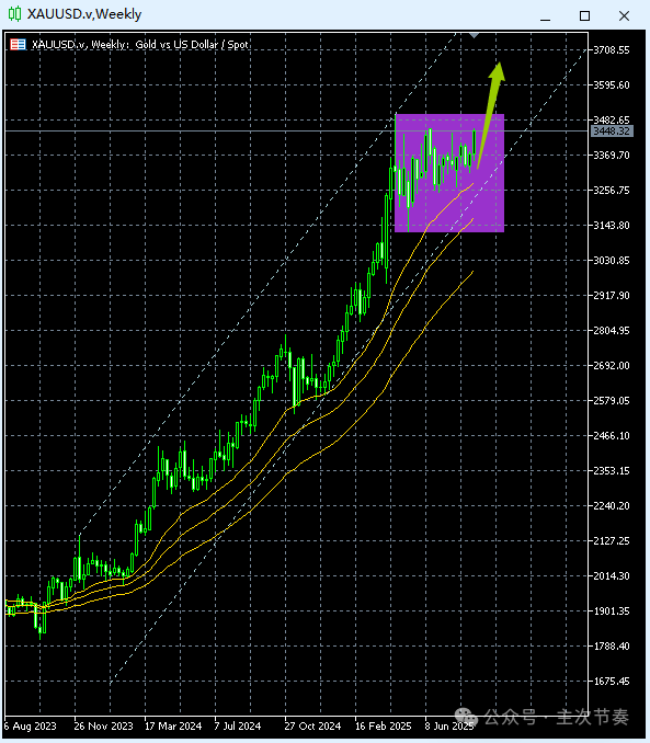 日线图终于又一次来到了区间上沿,刚好落在前期多次提到的3430-3451阻力带,再上方就只剩下历史高点3500这一个明显阻力。到了这样一个强阻力位置,市场情绪很容易发生分歧,波动幅度和动能交替都可能很大,能不能直接暴力拉升把全世界空头都打爆,是对多方人气的终极考验。可以预见,3500下方附近很可能不会是一个长期存在的市价,那么在当前位置,要么上破大幅拉升,要么受阻大幅下跌。这是一个大的变盘点。当然,从很多角度去分析,都是向上突破概率高,毕竟空方的打压在过去几个月已经越来越弱。Update: 2025-9-7