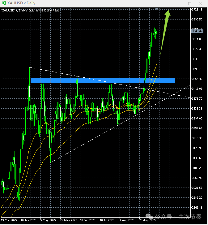无论从哪个角度,这次黄金向上突破横盘区间,都是成功的,而且突破之后的连续性相当好。当前正处在中期单边上涨过程中。从图中通道上沿的角度来看,接下来几天在3620附近会遇到一个阻力。但仅作为风险提醒,毕竟这个通道的有效性还没得到验证。当然,即便出现受阻,也只是一次上涨过程中的正常回调。Update: 2025-9-14