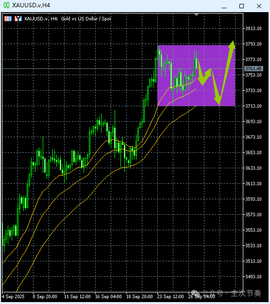 Inception: 2025-9-28黄金上周冲高之后,整体一直保持在高位震荡,这表示黄金的本轮上涨依然没有结束,高位盘整之后还将继续向上创新高。这是主次节奏的特征。本周而言,由于高位震荡还在延续,所以有望在图中区间内再次出现反复,通过这个反复的过程来重新积累上涨动能,也可以理解为对多方获利盘的消化。结合消息面,本周五美国会发布万众瞩目的非农就业报告,在此之前这几天也很符合震荡反复所需的市场氛围。使用说明: