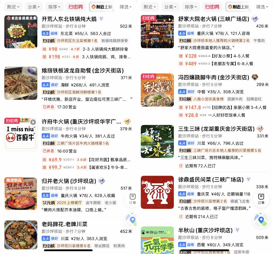重庆的魔幻地形和热辣鲜香对于很多游客来说都极具吸引力,从高德扫街榜可以看到,作为“十大吃货友好高铁站”之一的重庆沙坪坝高铁站周边有多家高分餐厅,涵盖重庆火锅、跷脚牛肉、东北菜、川菜、西餐、日料等各种美食类型。