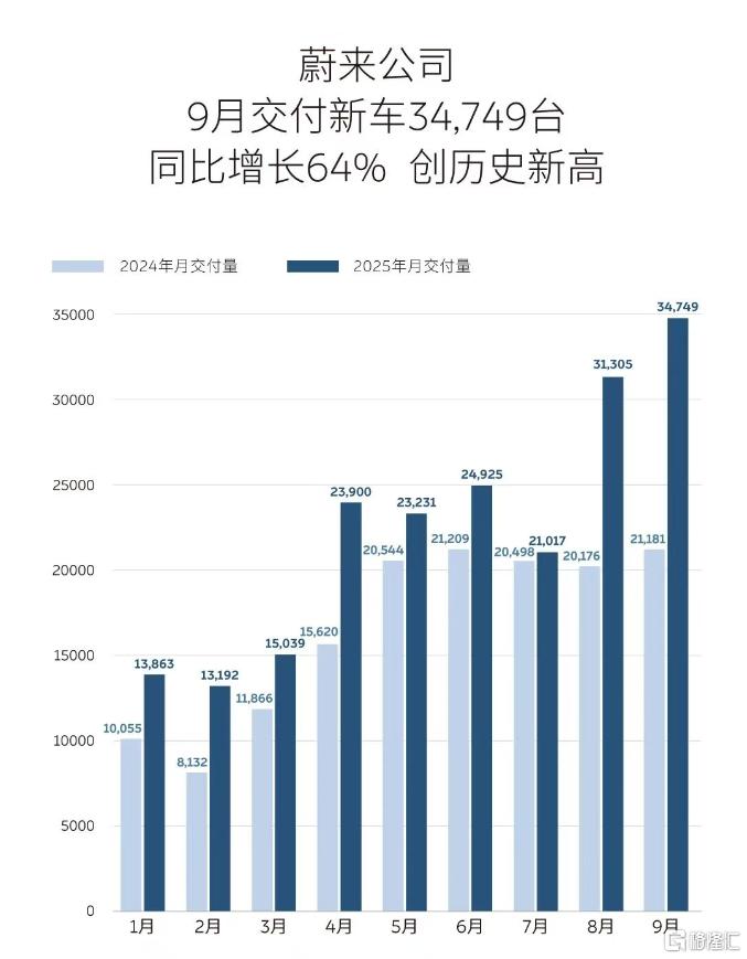 蔚来公司发布的数据显示,9月蔚来交付新车34749台,同比增长64%。