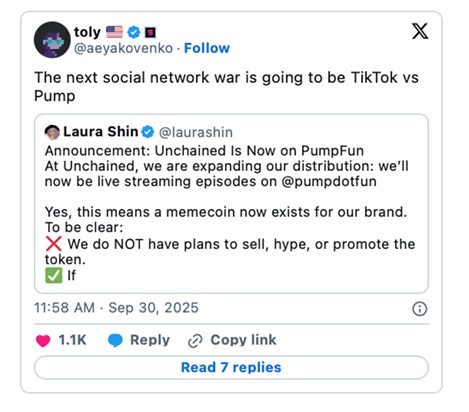 据传,Solana 创始人 Anatoly Yakovenko 曾评论 Pump.fun 未来可能通过直播功能媲美 TikTok,这或许成为了 PUMP 拉盘的重要推手。