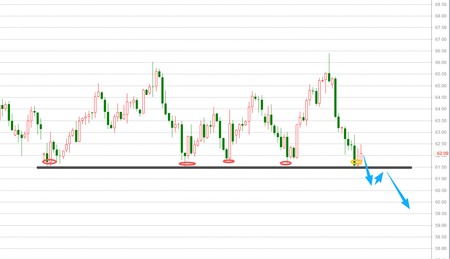 原油,短期连续下跌,价格又再次靠近了日线级别支撑61.4,前期已经支撑了四次,这次是第五次,谨防下破。倘若有效下破会打开下跌空间,可以关注破位追空机会。
